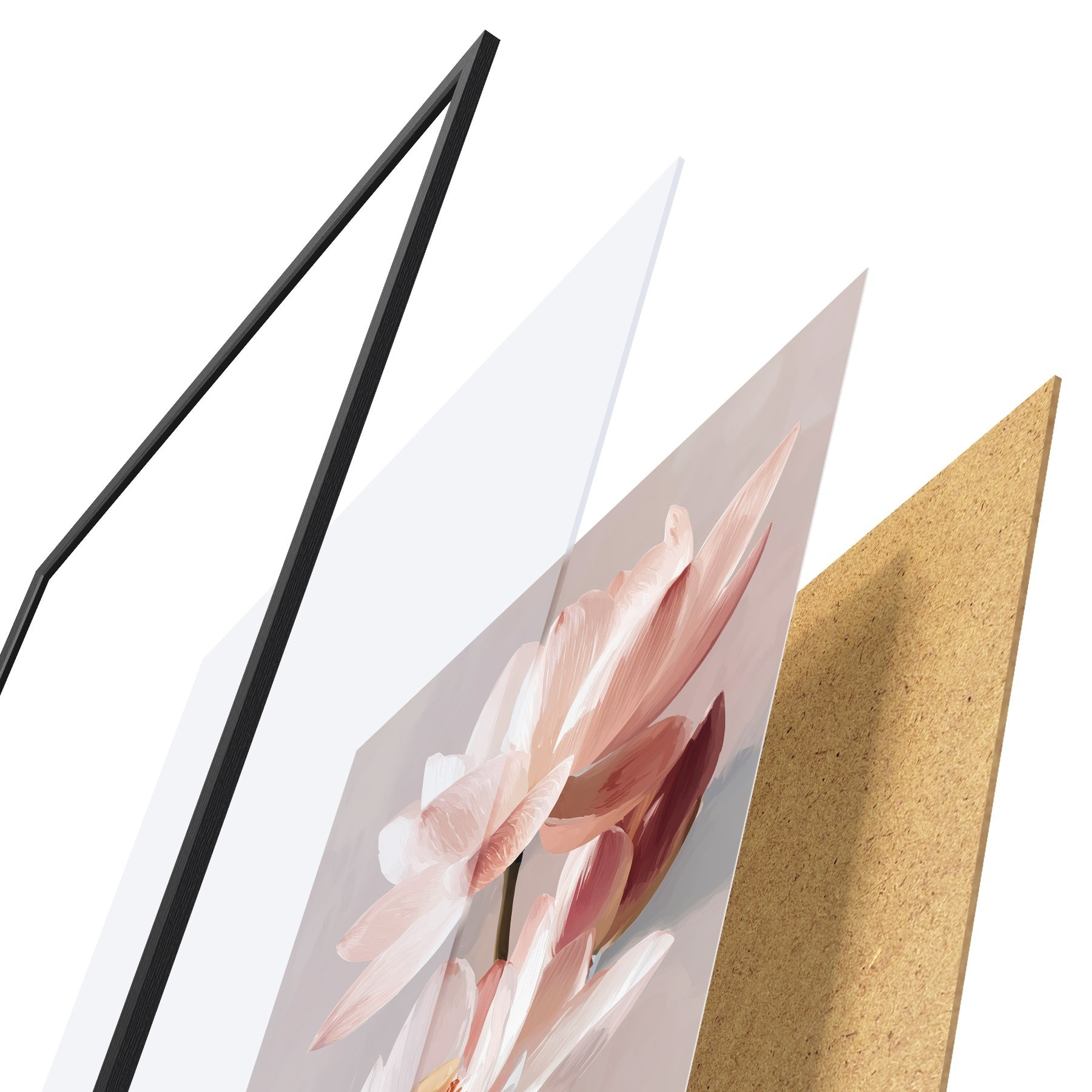 El póster consta de marco, plexiglás, imagen impresa y soporte de aglomerado. El póster puede colgarse inmediatamente en la pared gracias a los soportes de la parte posterior.