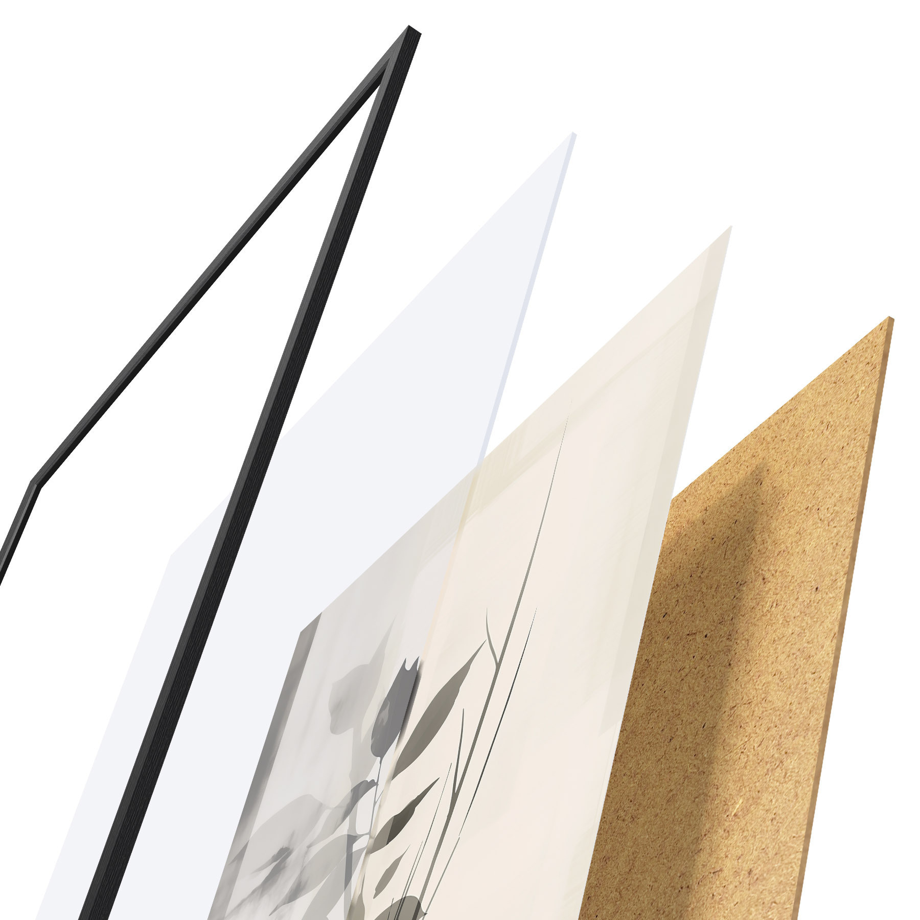 El póster consta de marco, plexiglás, imagen impresa y soporte de aglomerado. El póster puede colgarse inmediatamente en la pared gracias a los soportes de la parte posterior.