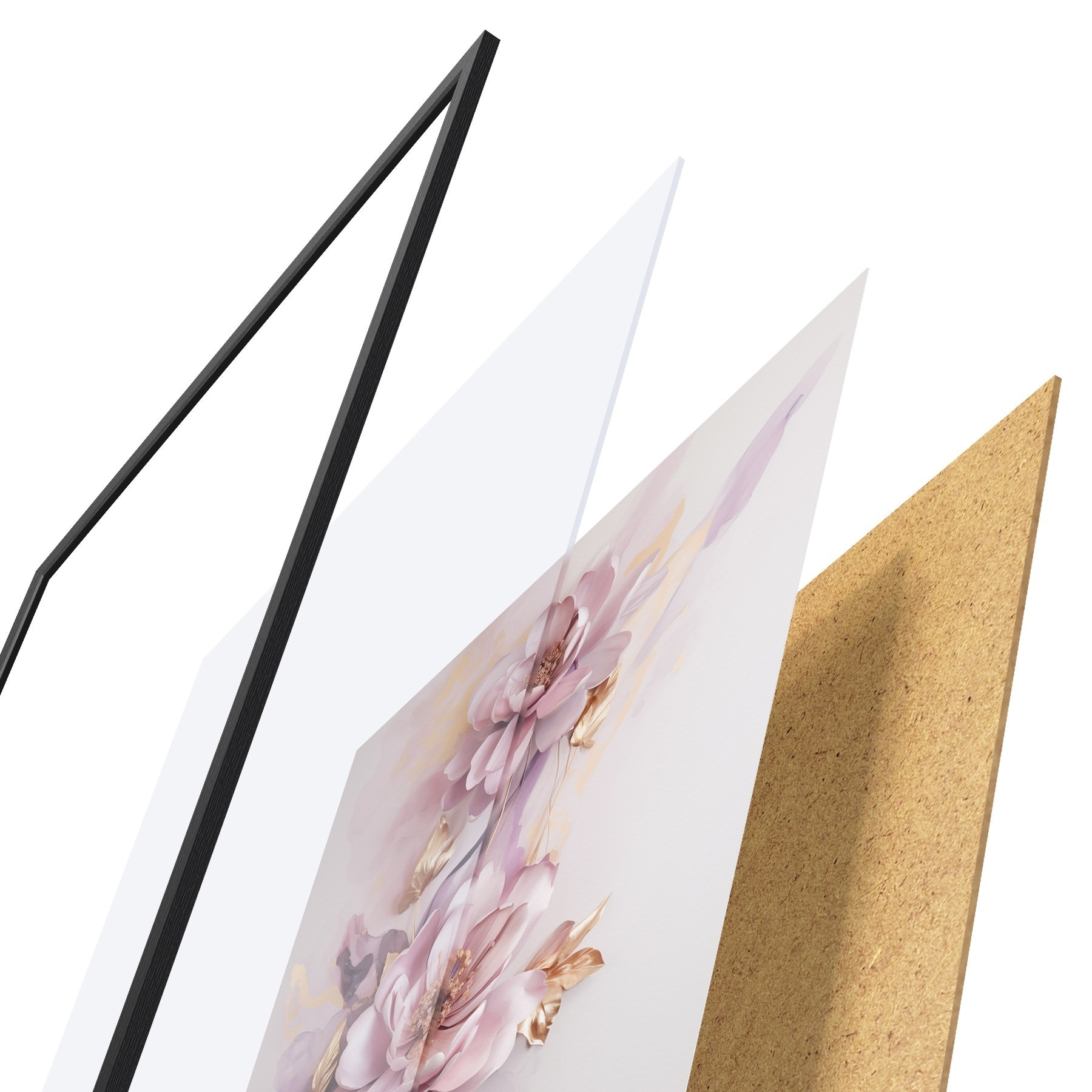 El póster consta de marco, plexiglás, imagen impresa y soporte de aglomerado. El póster puede colgarse inmediatamente en la pared gracias a los soportes de la parte posterior.