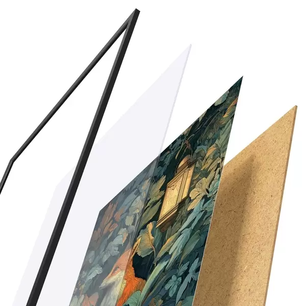 El póster consta de marco, plexiglás, imagen impresa y soporte de aglomerado. El póster puede colgarse inmediatamente en la pared gracias a los soportes de la parte posterior.