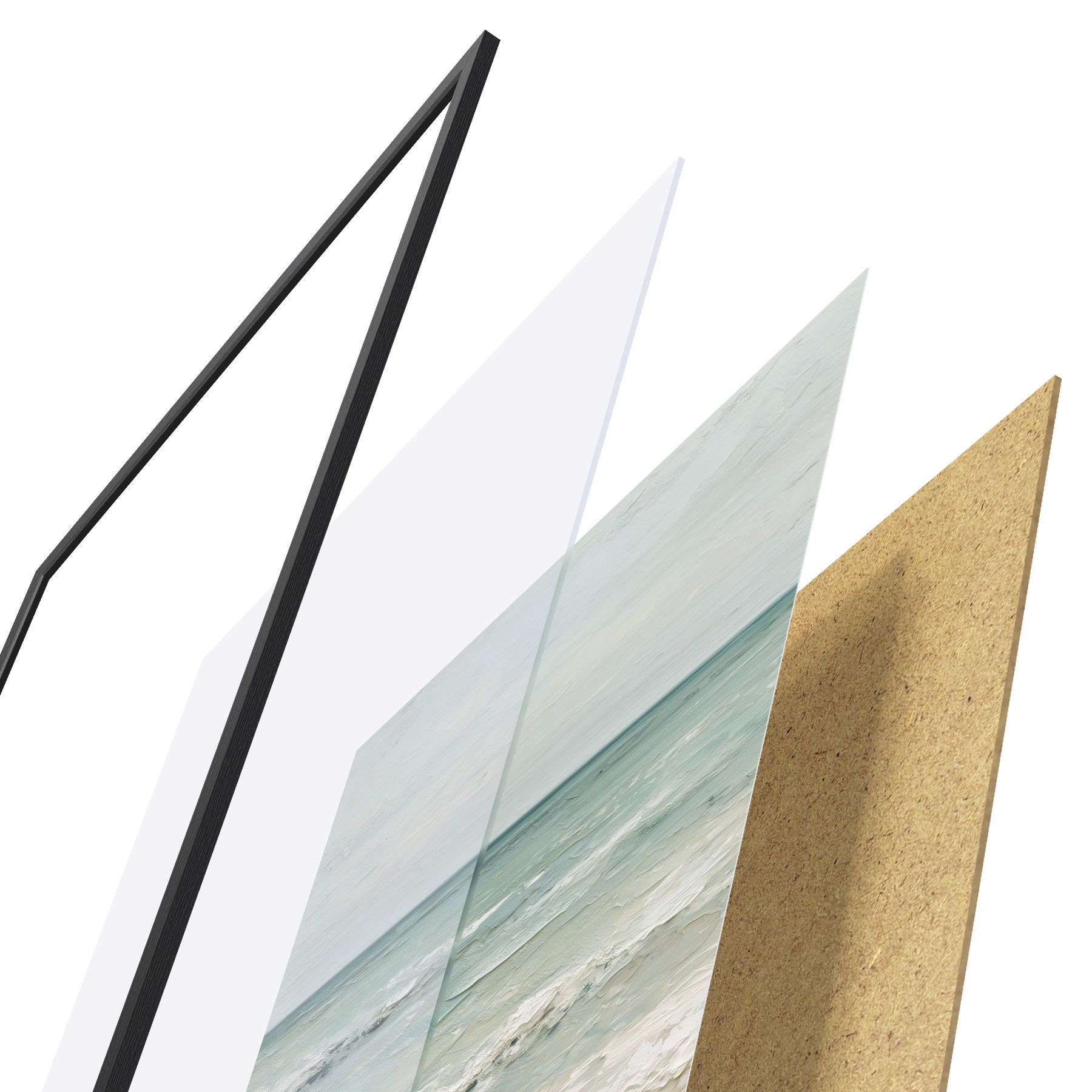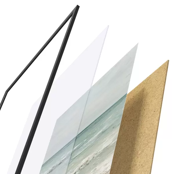 El póster consta de marco, plexiglás, imagen impresa y soporte de aglomerado. El póster puede colgarse inmediatamente en la pared gracias a los soportes de la parte posterior.