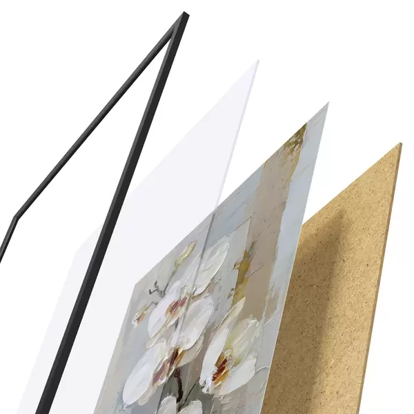 El póster consta de marco, plexiglás, imagen impresa y soporte de aglomerado. El póster puede colgarse inmediatamente en la pared gracias a los soportes de la parte posterior.
