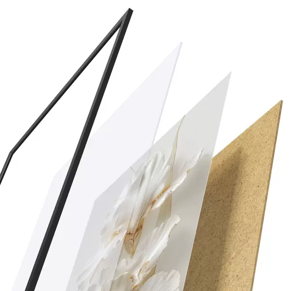 El póster consta de marco, plexiglás, imagen impresa y soporte de aglomerado. El póster puede colgarse inmediatamente en la pared gracias a los soportes de la parte posterior.