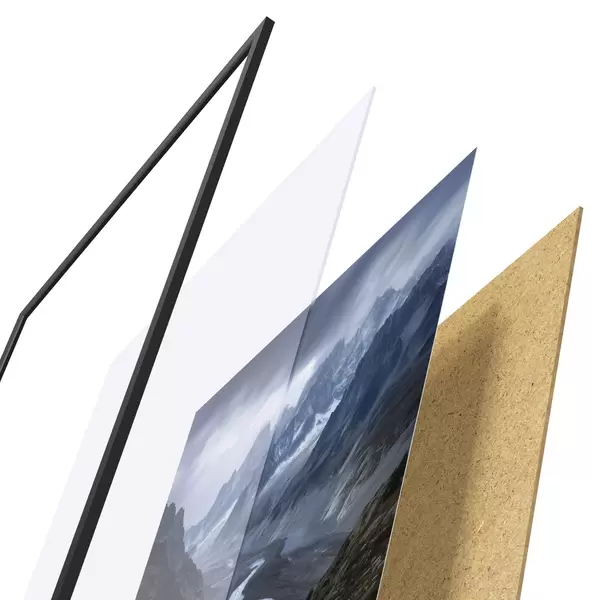 El póster consta de marco, plexiglás, imagen impresa y soporte de aglomerado. El póster puede colgarse inmediatamente en la pared gracias a los soportes de la parte posterior.