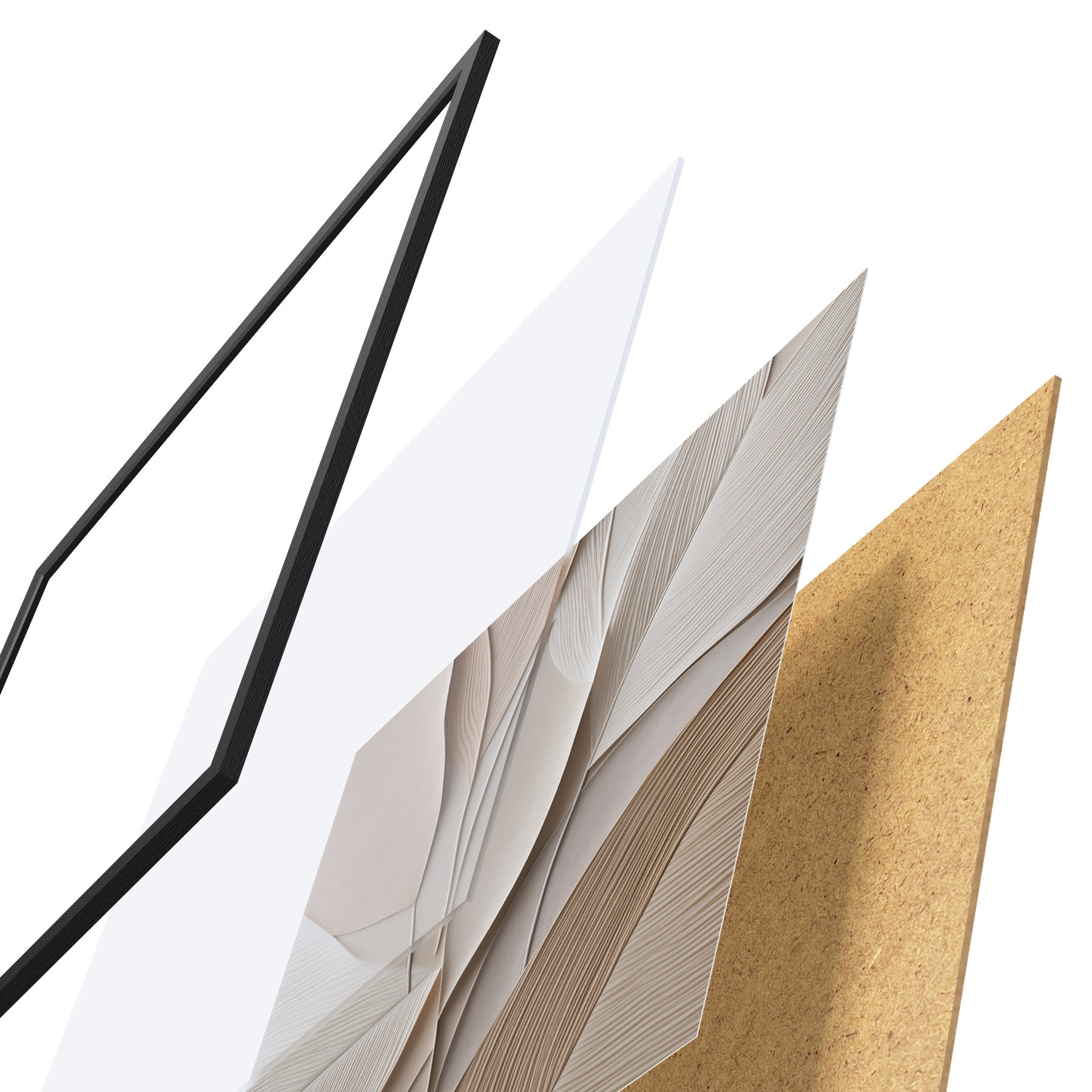 El póster consta de marco, plexiglás, imagen impresa y soporte de aglomerado. El póster puede colgarse inmediatamente en la pared gracias a los soportes de la parte posterior.