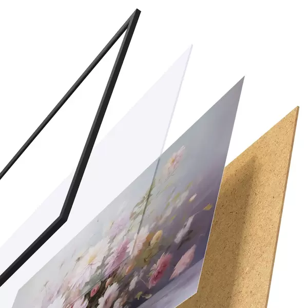 El póster consta de marco, plexiglás, imagen impresa y soporte de aglomerado. El póster puede colgarse inmediatamente en la pared gracias a los soportes de la parte posterior.