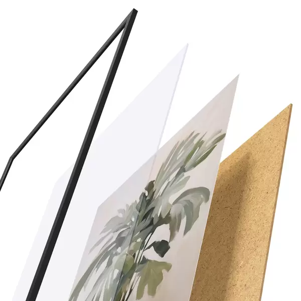 El póster consta de marco, plexiglás, imagen impresa y soporte de aglomerado. El póster puede colgarse inmediatamente en la pared gracias a los soportes de la parte posterior.