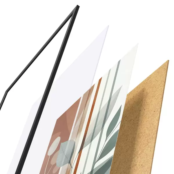 El póster consta de marco, plexiglás, imagen impresa y soporte de aglomerado. El póster puede colgarse inmediatamente en la pared gracias a los soportes de la parte posterior.