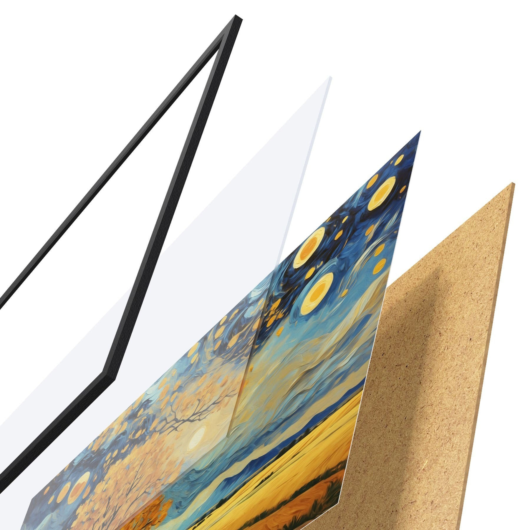 El póster consta de marco, plexiglás, imagen impresa y soporte de aglomerado. El póster puede colgarse inmediatamente en la pared gracias a los soportes de la parte posterior.