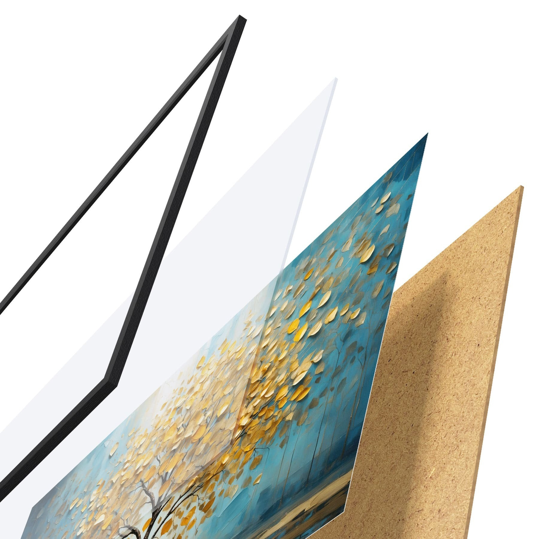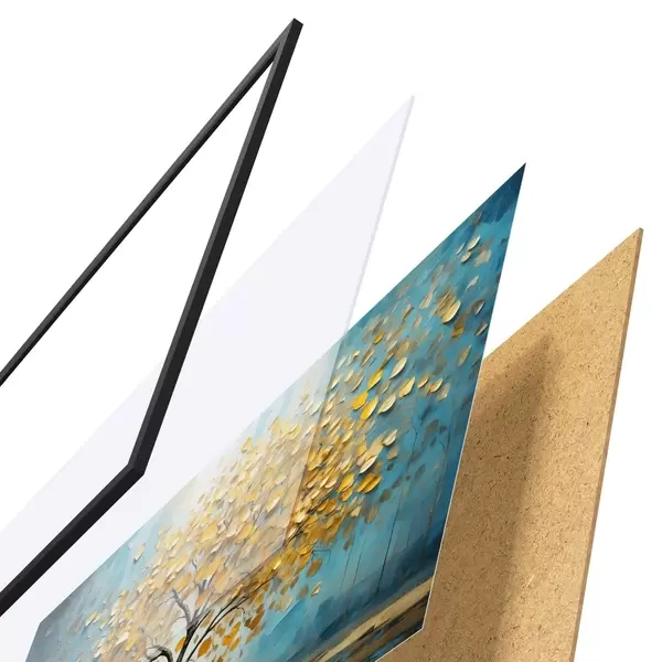 El póster consta de marco, plexiglás, imagen impresa y soporte de aglomerado. El póster puede colgarse inmediatamente en la pared gracias a los soportes de la parte posterior.