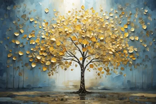 Poster Árbol con hojas amarillas sobre tonos azules f47256
