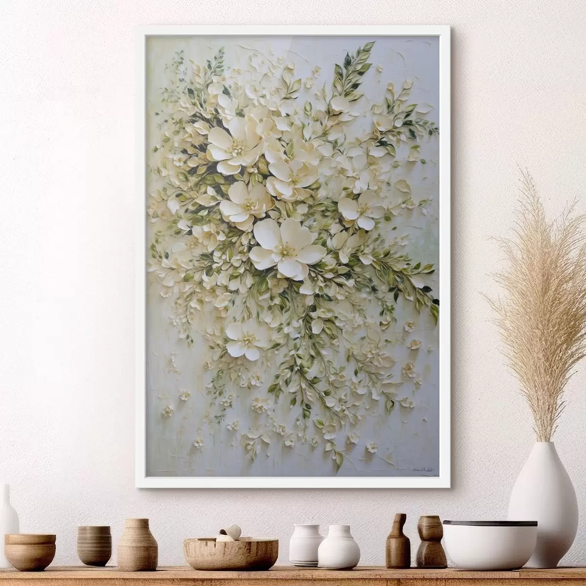 Poster Gran composición de flores y hojas color crema. Nr f47267