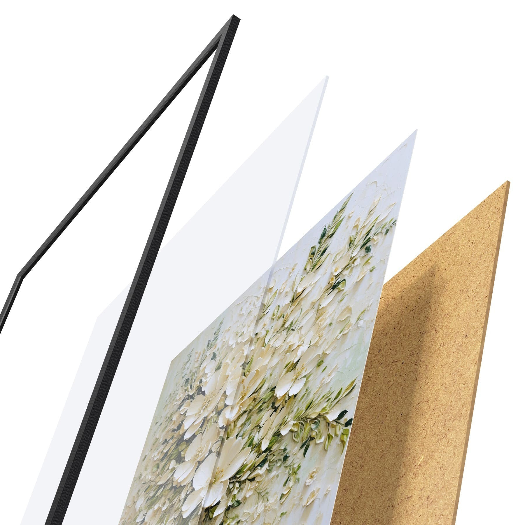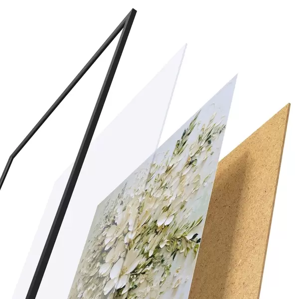 El póster consta de marco, plexiglás, imagen impresa y soporte de aglomerado. El póster puede colgarse inmediatamente en la pared gracias a los soportes de la parte posterior.
