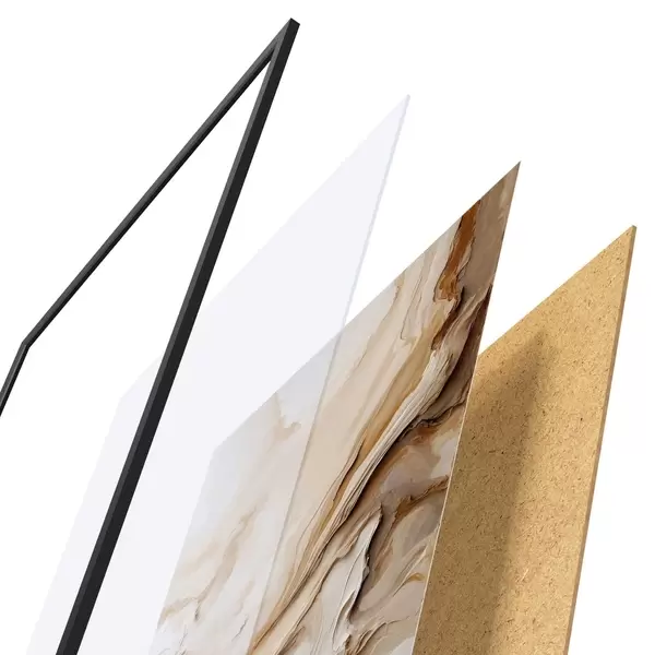 El póster consta de marco, plexiglás, imagen impresa y soporte de aglomerado. El póster puede colgarse inmediatamente en la pared gracias a los soportes de la parte posterior.