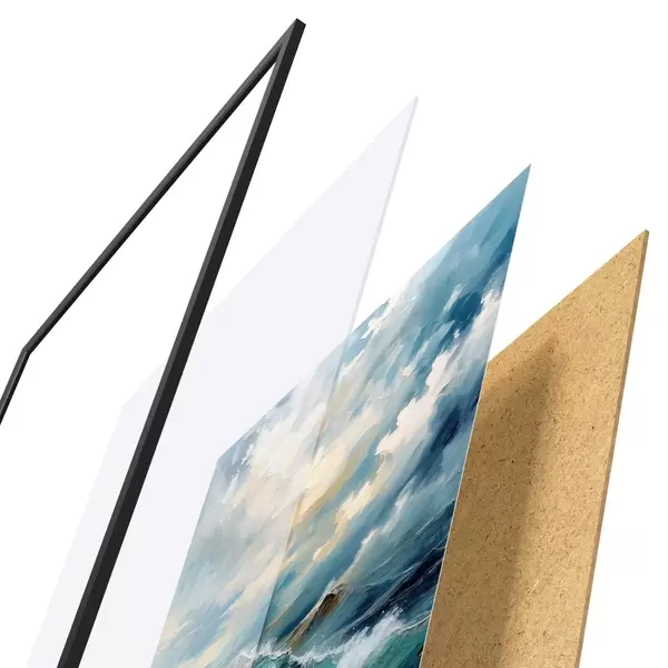 El póster consta de marco, plexiglás, imagen impresa y soporte de aglomerado. El póster puede colgarse inmediatamente en la pared gracias a los soportes de la parte posterior.