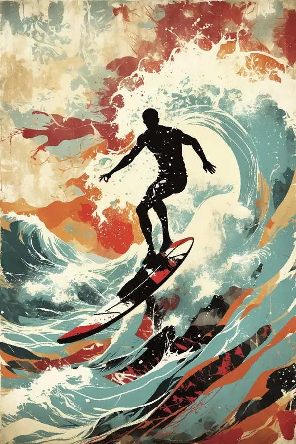 Poster Silueta de surfista sobre olas en colores vivos f47284