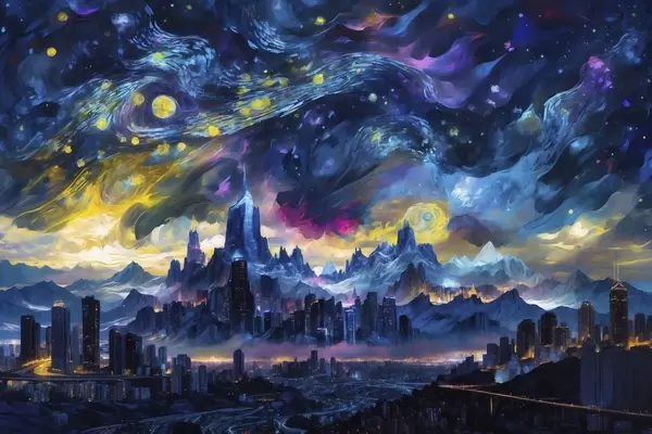 Poster Ciudad fantástica bajo un cielo nocturno resplandeciente f47288