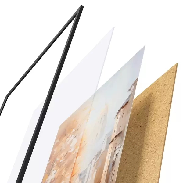 El póster consta de marco, plexiglás, imagen impresa y soporte de aglomerado. El póster puede colgarse inmediatamente en la pared gracias a los soportes de la parte posterior.