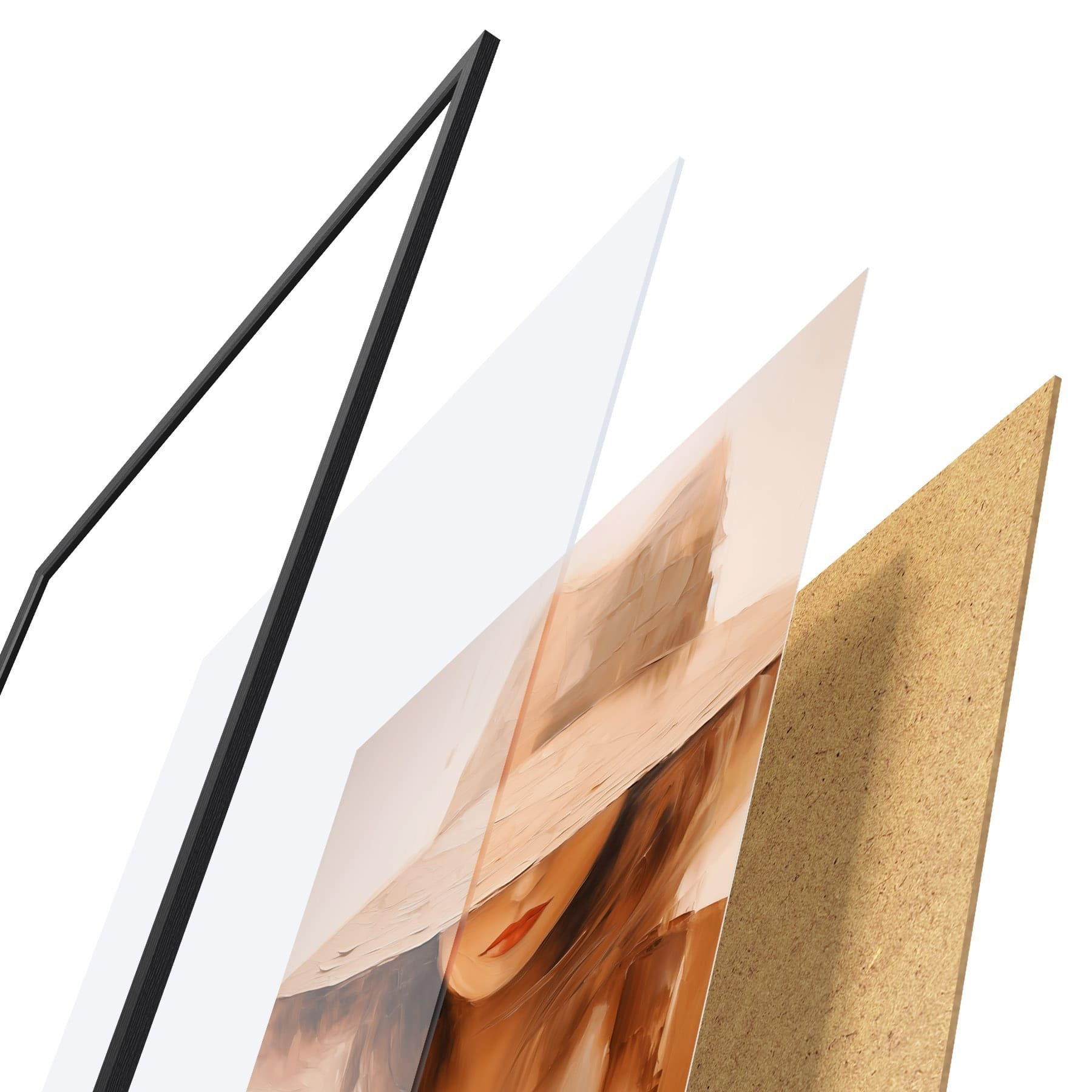 El póster consta de marco, plexiglás, imagen impresa y soporte de aglomerado. El póster puede colgarse inmediatamente en la pared gracias a los soportes de la parte posterior.