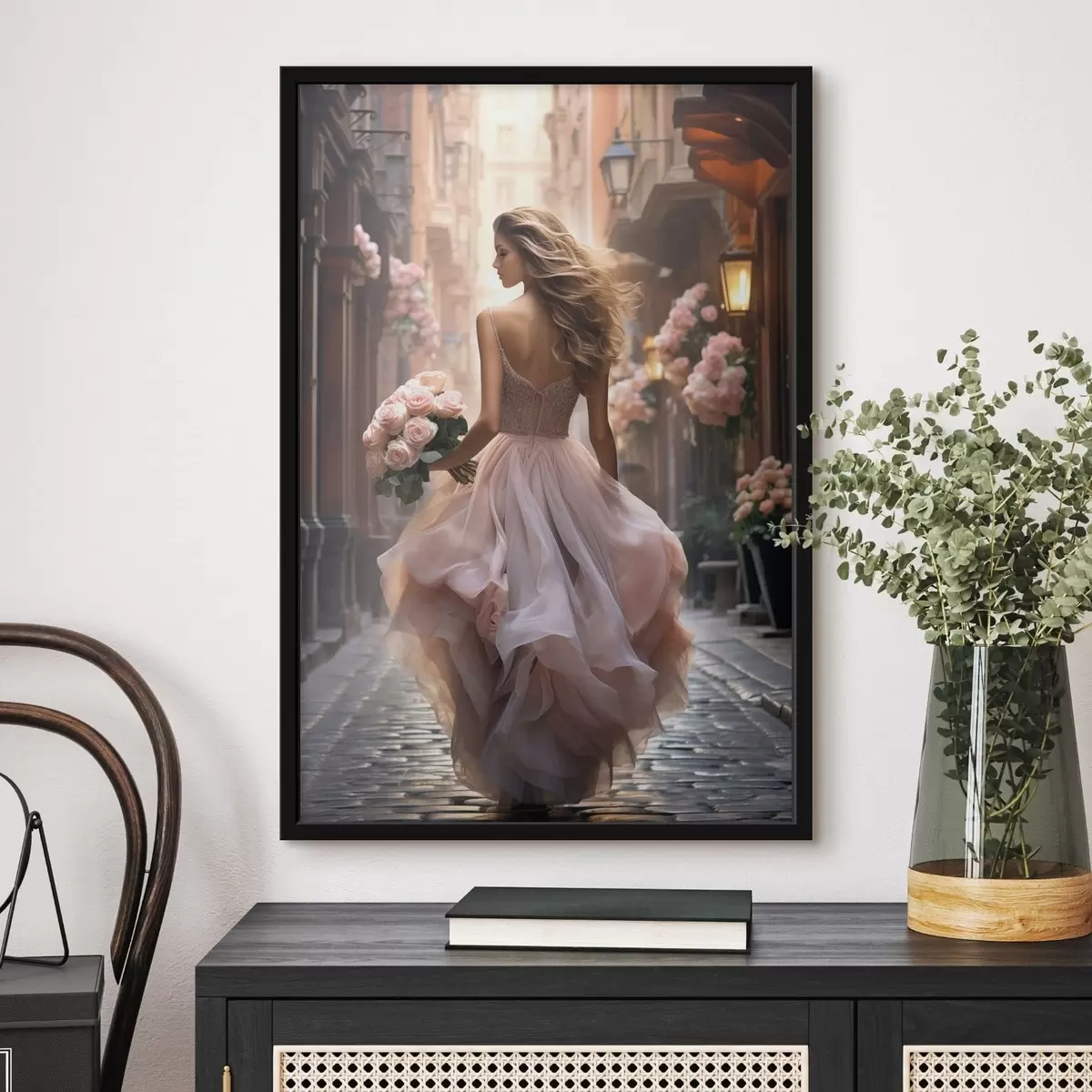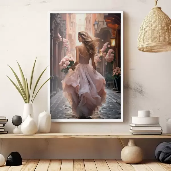 Poster Mujer con un vestido rosa caminando por una calle. Nr f47316