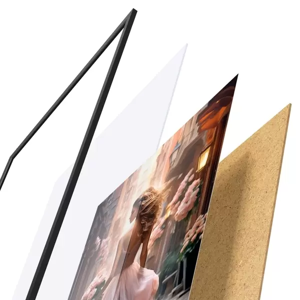 El póster consta de marco, plexiglás, imagen impresa y soporte de aglomerado. El póster puede colgarse inmediatamente en la pared gracias a los soportes de la parte posterior.