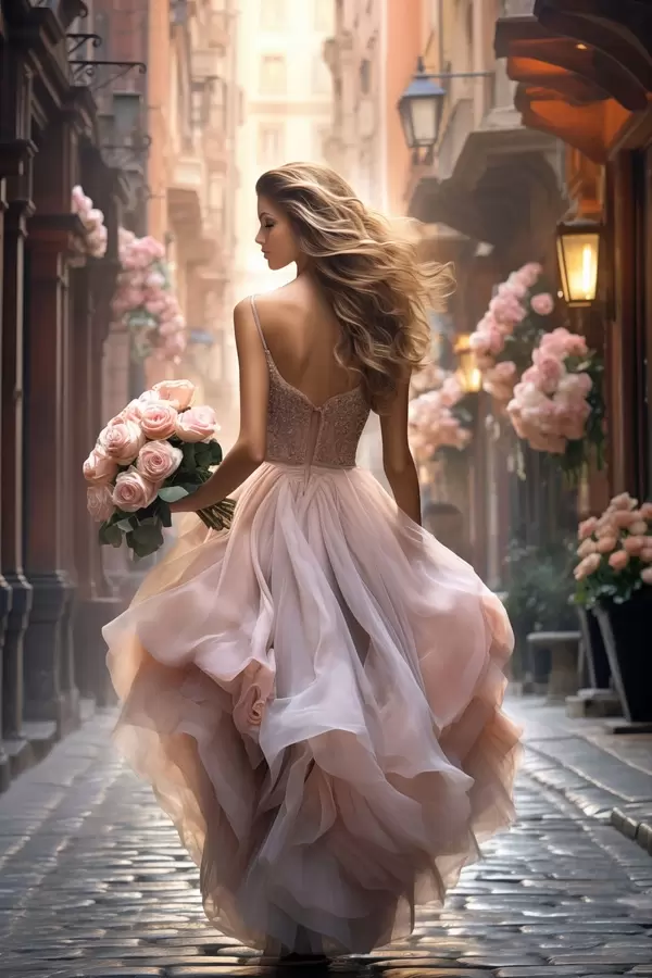 Poster Mujer con un vestido rosa caminando por una calle. Nr f47316