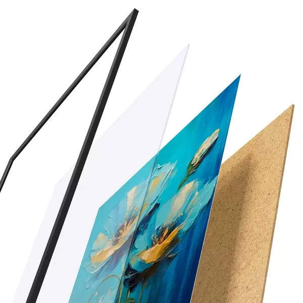 El póster consta de marco, plexiglás, imagen impresa y soporte de aglomerado. El póster puede colgarse inmediatamente en la pared gracias a los soportes de la parte posterior.
