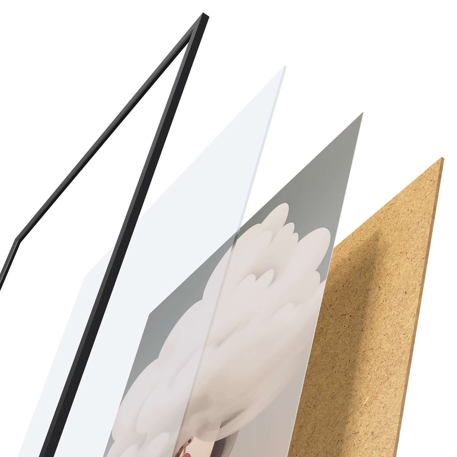 El póster consta de marco, plexiglás, imagen impresa y soporte de aglomerado. El póster puede colgarse inmediatamente en la pared gracias a los soportes de la parte posterior.