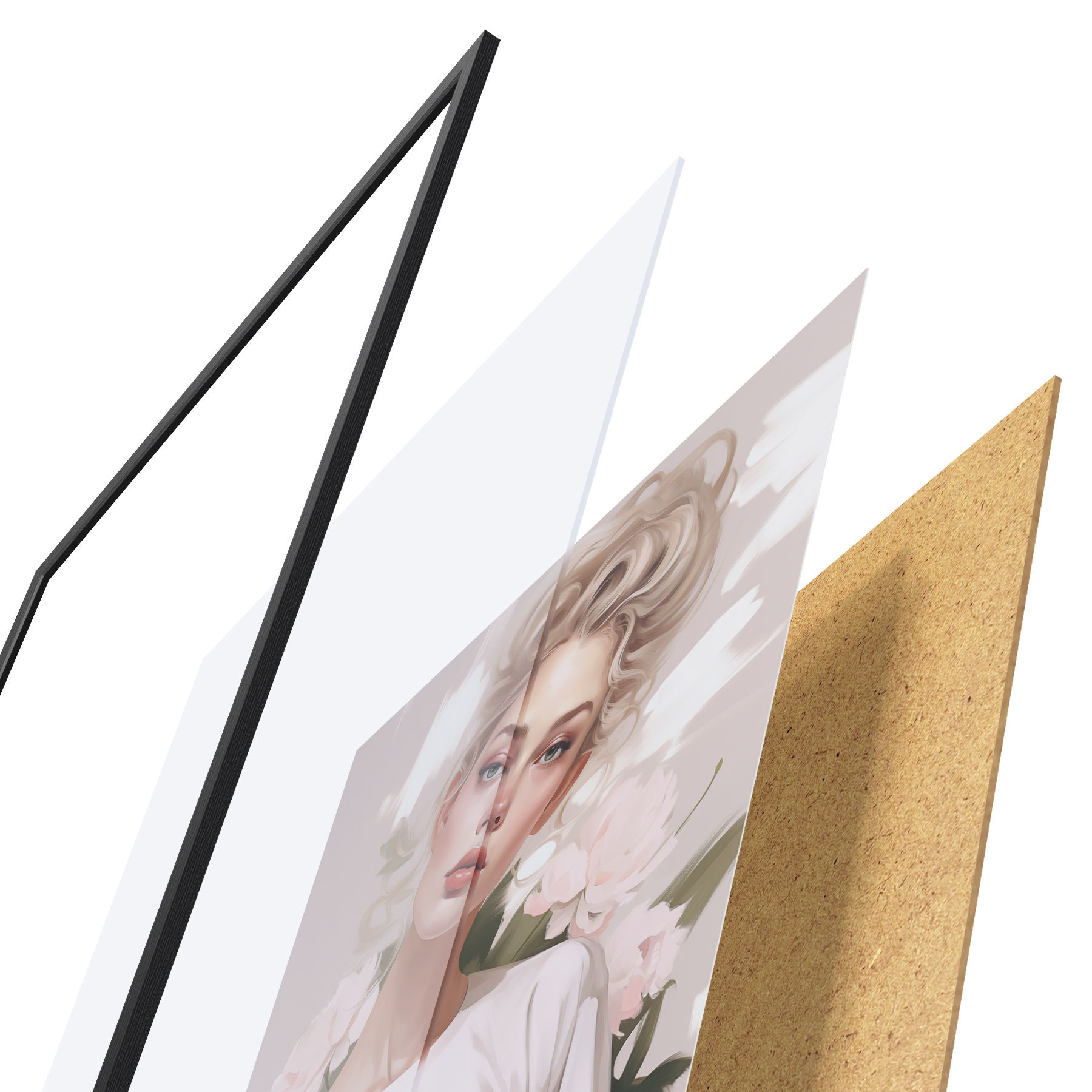 El póster consta de marco, plexiglás, imagen impresa y soporte de aglomerado. El póster puede colgarse inmediatamente en la pared gracias a los soportes de la parte posterior.