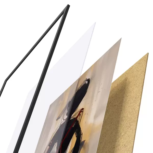 El póster consta de marco, plexiglás, imagen impresa y soporte de aglomerado. El póster puede colgarse inmediatamente en la pared gracias a los soportes de la parte posterior.