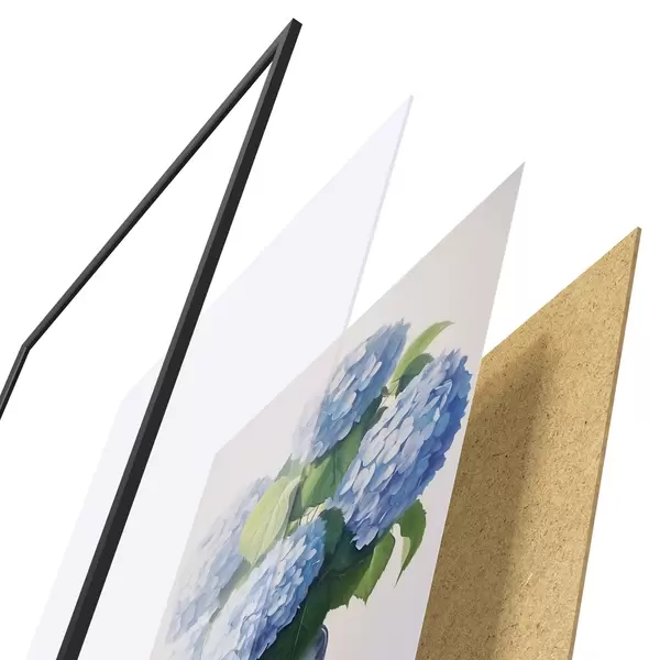 El póster consta de marco, plexiglás, imagen impresa y soporte de aglomerado. El póster puede colgarse inmediatamente en la pared gracias a los soportes de la parte posterior.