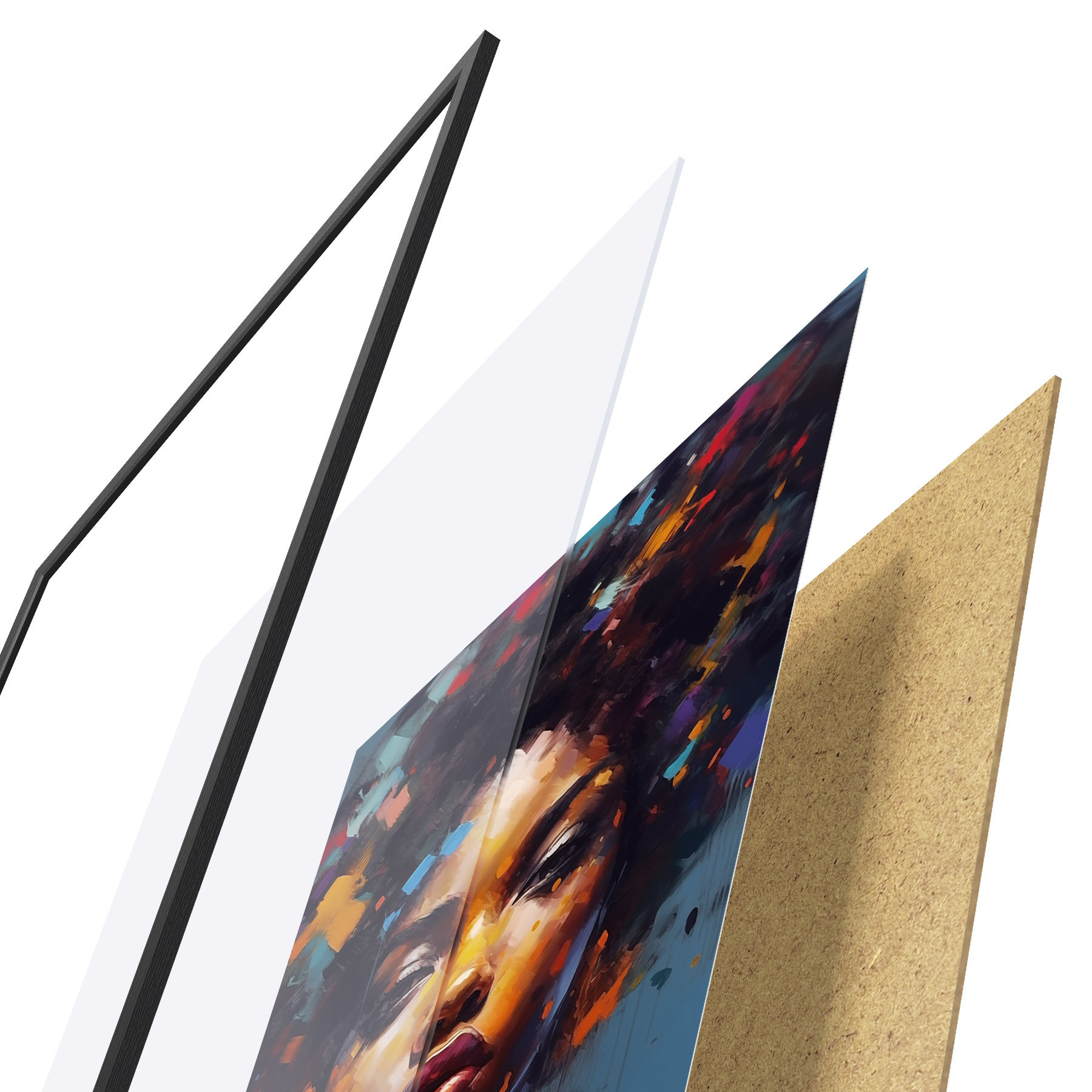 El póster consta de marco, plexiglás, imagen impresa y soporte de aglomerado. El póster puede colgarse inmediatamente en la pared gracias a los soportes de la parte posterior.