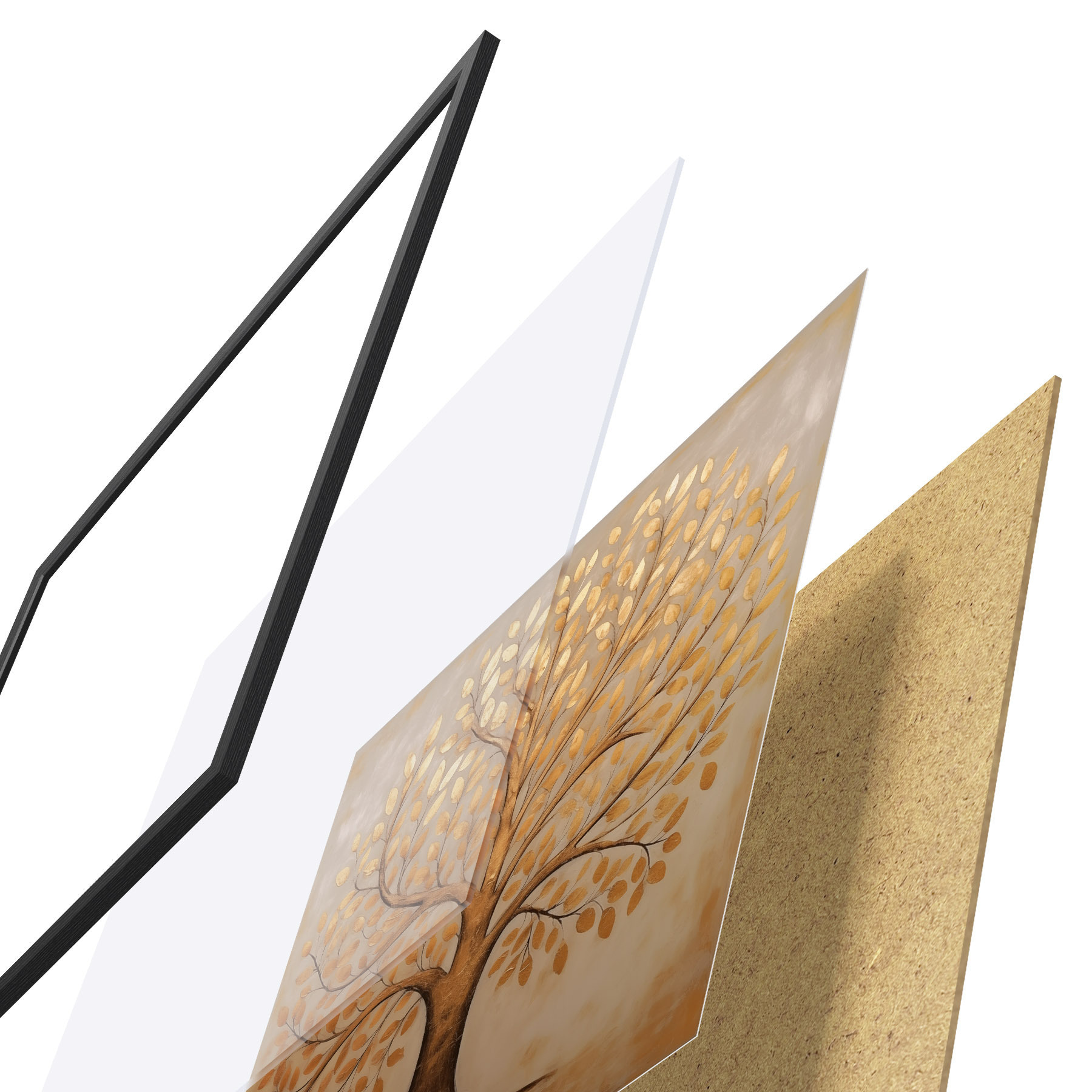 El póster consta de marco, plexiglás, imagen impresa y soporte de aglomerado. El póster puede colgarse inmediatamente en la pared gracias a los soportes de la parte posterior.