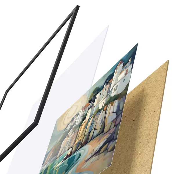 El póster consta de marco, plexiglás, imagen impresa y soporte de aglomerado. El póster puede colgarse inmediatamente en la pared gracias a los soportes de la parte posterior.