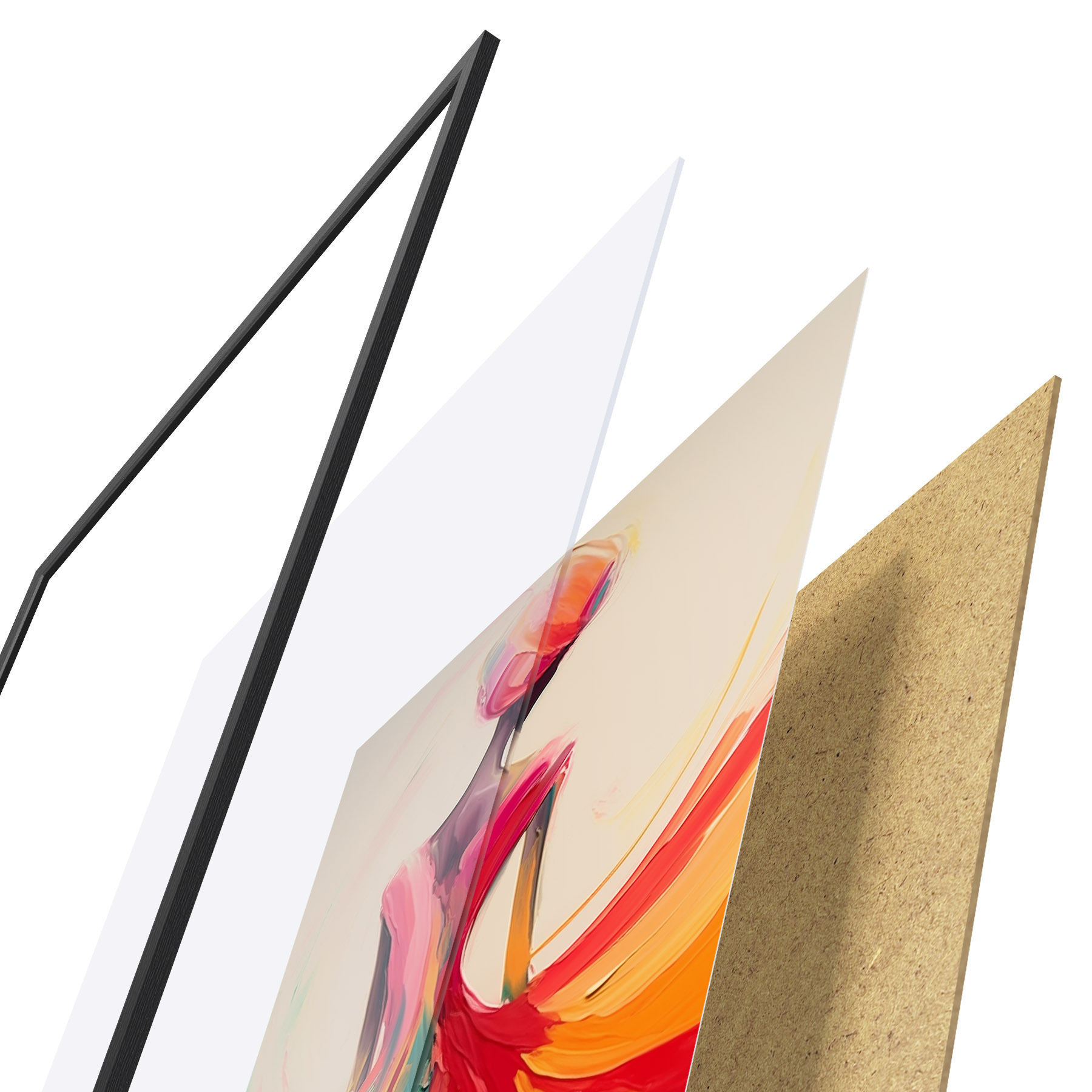 El póster consta de marco, plexiglás, imagen impresa y soporte de aglomerado. El póster puede colgarse inmediatamente en la pared gracias a los soportes de la parte posterior.