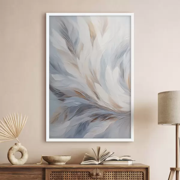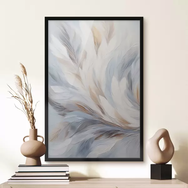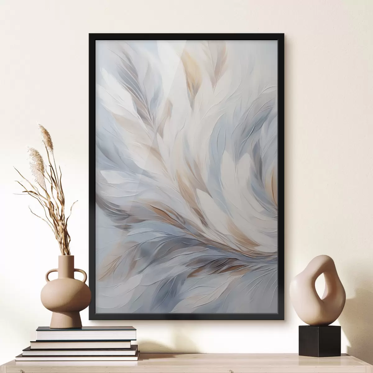 Poster Pintura abstracta de plumas en tonos blancos, azules y marrones, con una textura suave y fluida y un fondo claro. f47417