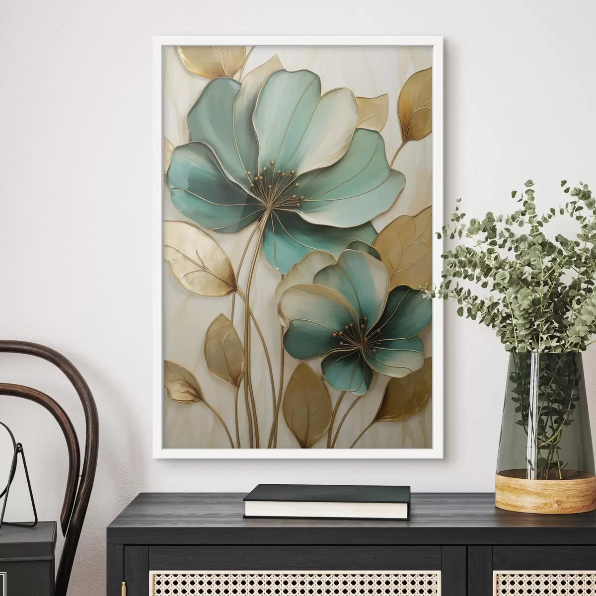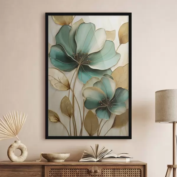 Poster Grandes flores verde azuladas y amarillas con contornos, rodeadas de hojas amarillas sobre un fondo abstracto. Nr f47418