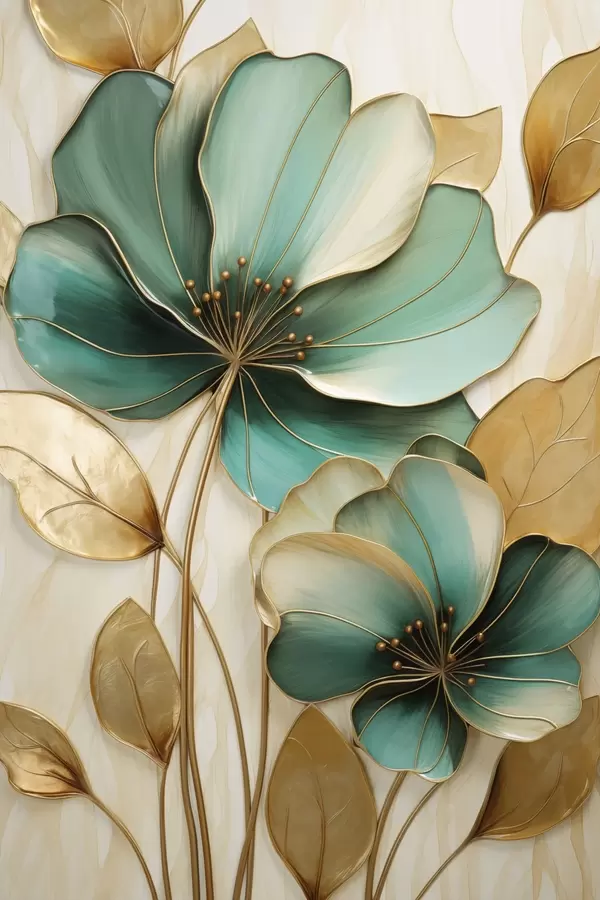 Poster Grandes flores verde azuladas y amarillas con contornos, rodeadas de hojas amarillas sobre un fondo abstracto. Nr f47418