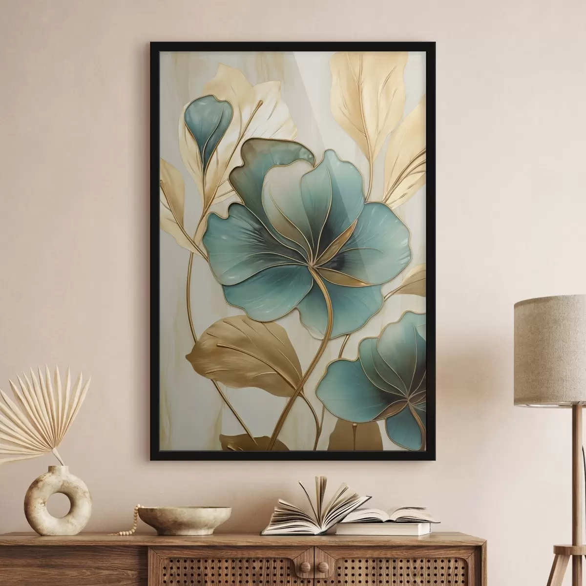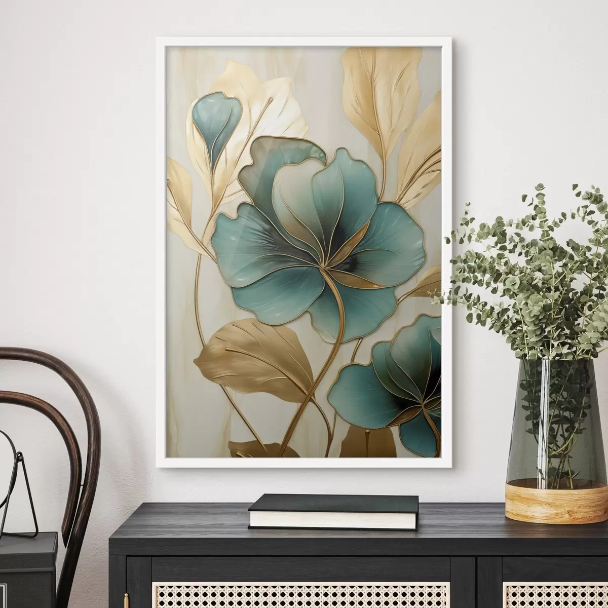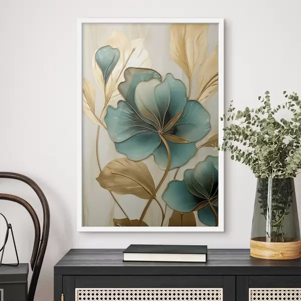 Poster Grandes flores verde azuladas y amarillas con contornos, rodeadas de hojas amarillas sobre un fondo abstracto. Nr f47419