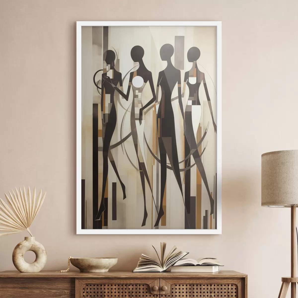 Poster Figuras femeninas estilizadas con elementos geométricos sobre un fondo abstracto de líneas verticales. f47423