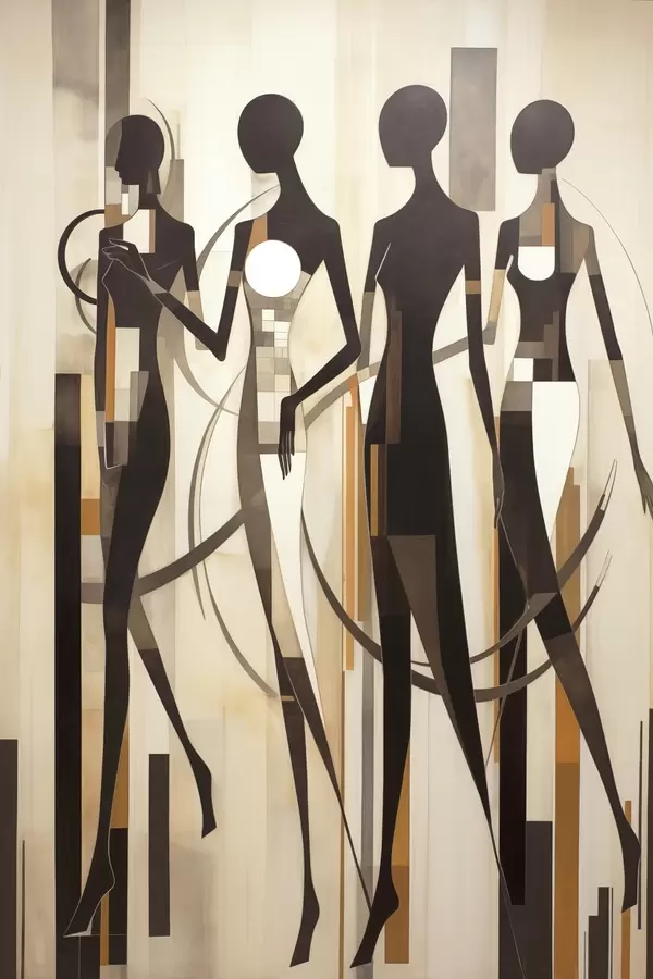 Poster Figuras femeninas estilizadas con elementos geométricos sobre un fondo abstracto de líneas verticales. Nr f47423