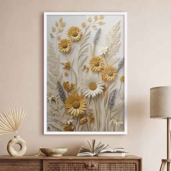 Poster Una colección texturizada de margaritas amarillas y blancas con hierbas secas y ramitas de lavanda sobre un fondo blanco. Nr f47430