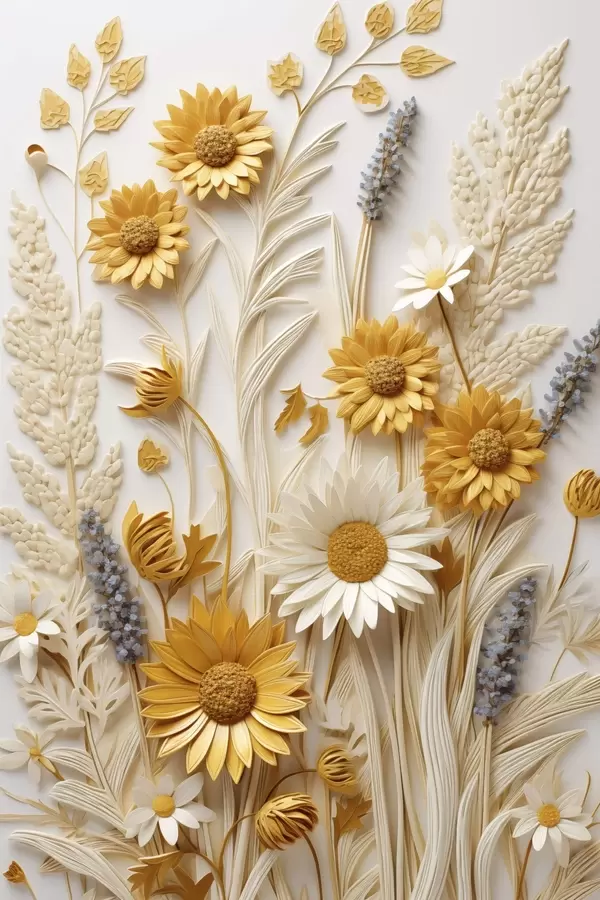 Poster Una colección texturizada de margaritas amarillas y blancas con hierbas secas y ramitas de lavanda sobre un fondo blanco. f47430