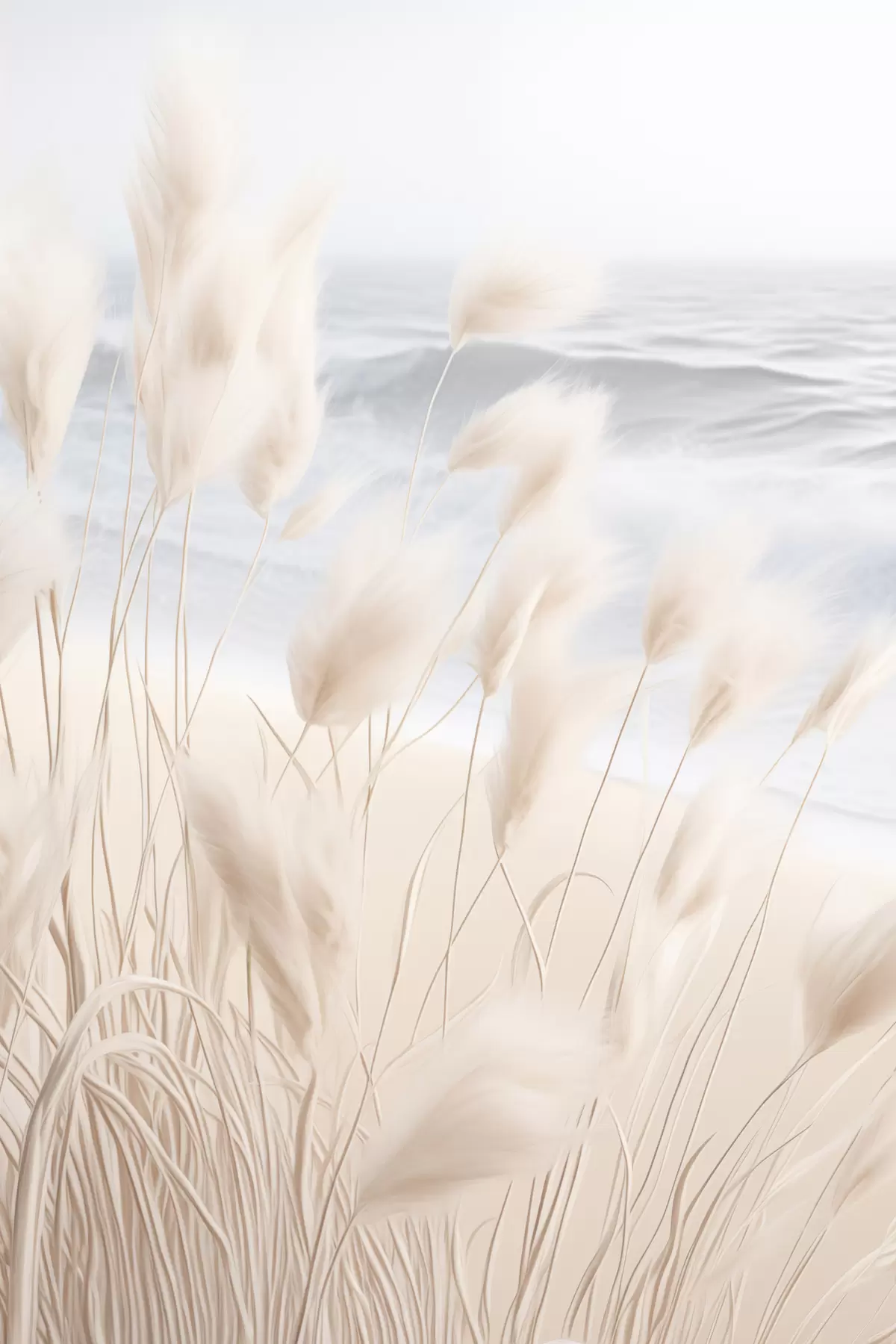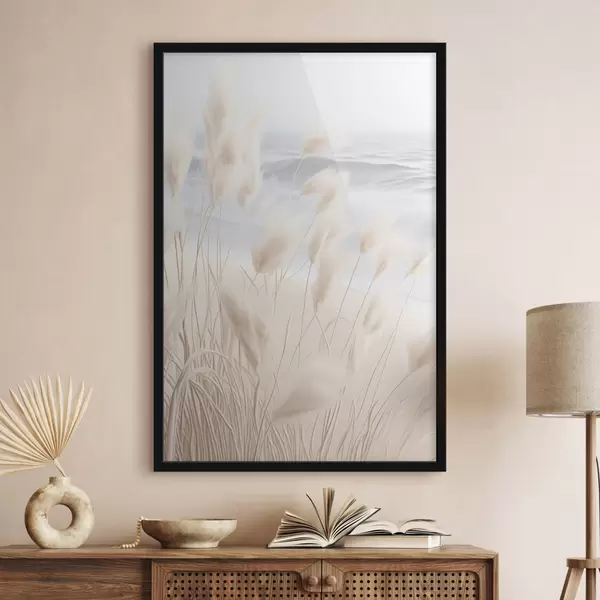 Poster Hierba alta y plumosa de la pampa en suaves tonos beige en primer plano, con una playa de arena al fondo. f47432