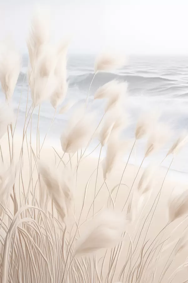 Poster Hierba alta y plumosa de la pampa en suaves tonos beige en primer plano, con una playa de arena al fondo. f47432