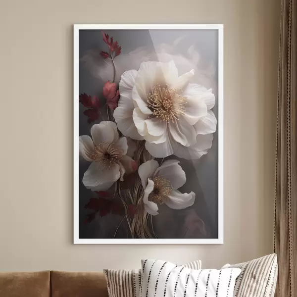 Poster Delicadas peonías con pétalos finos y tenues, rodeadas de hojas de color rojo oscuro sobre un fondo abstracto. Nr f47434