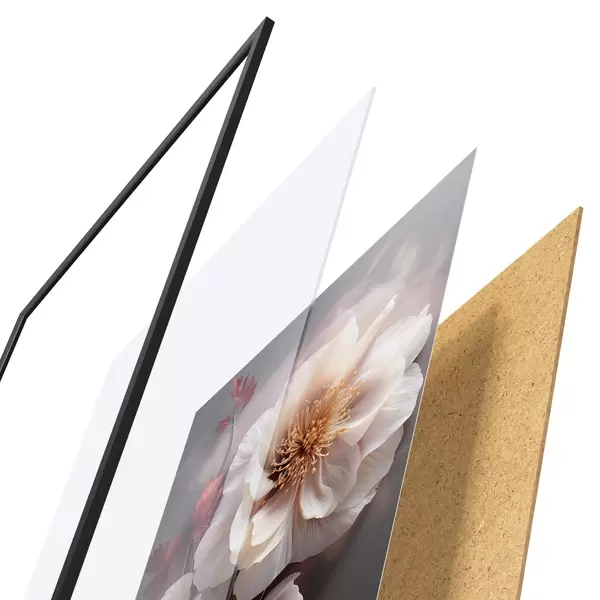 El póster consta de marco, plexiglás, imagen impresa y soporte de aglomerado. El póster puede colgarse inmediatamente en la pared gracias a los soportes de la parte posterior.