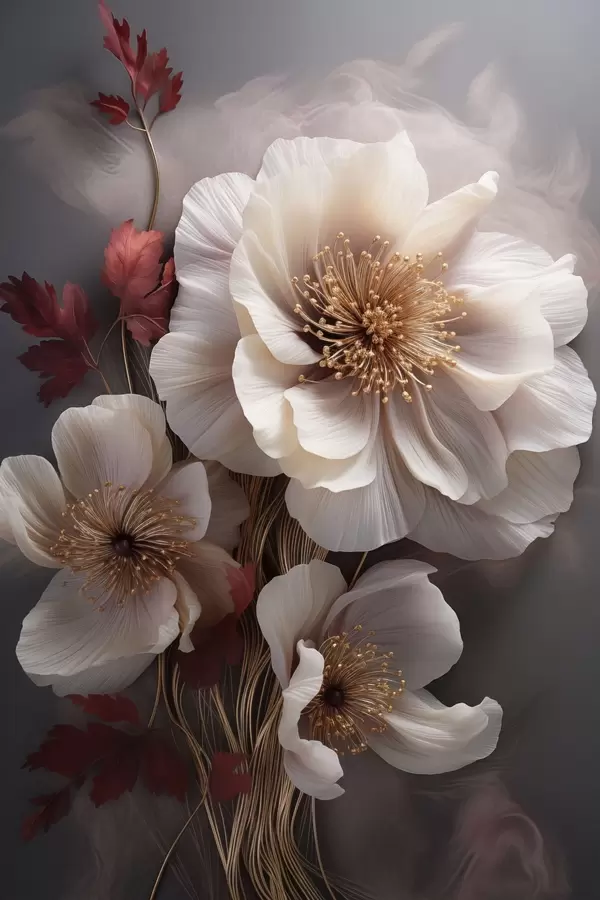 Poster Delicadas peonías con pétalos finos y tenues, rodeadas de hojas de color rojo oscuro sobre un fondo abstracto. Nr f47434