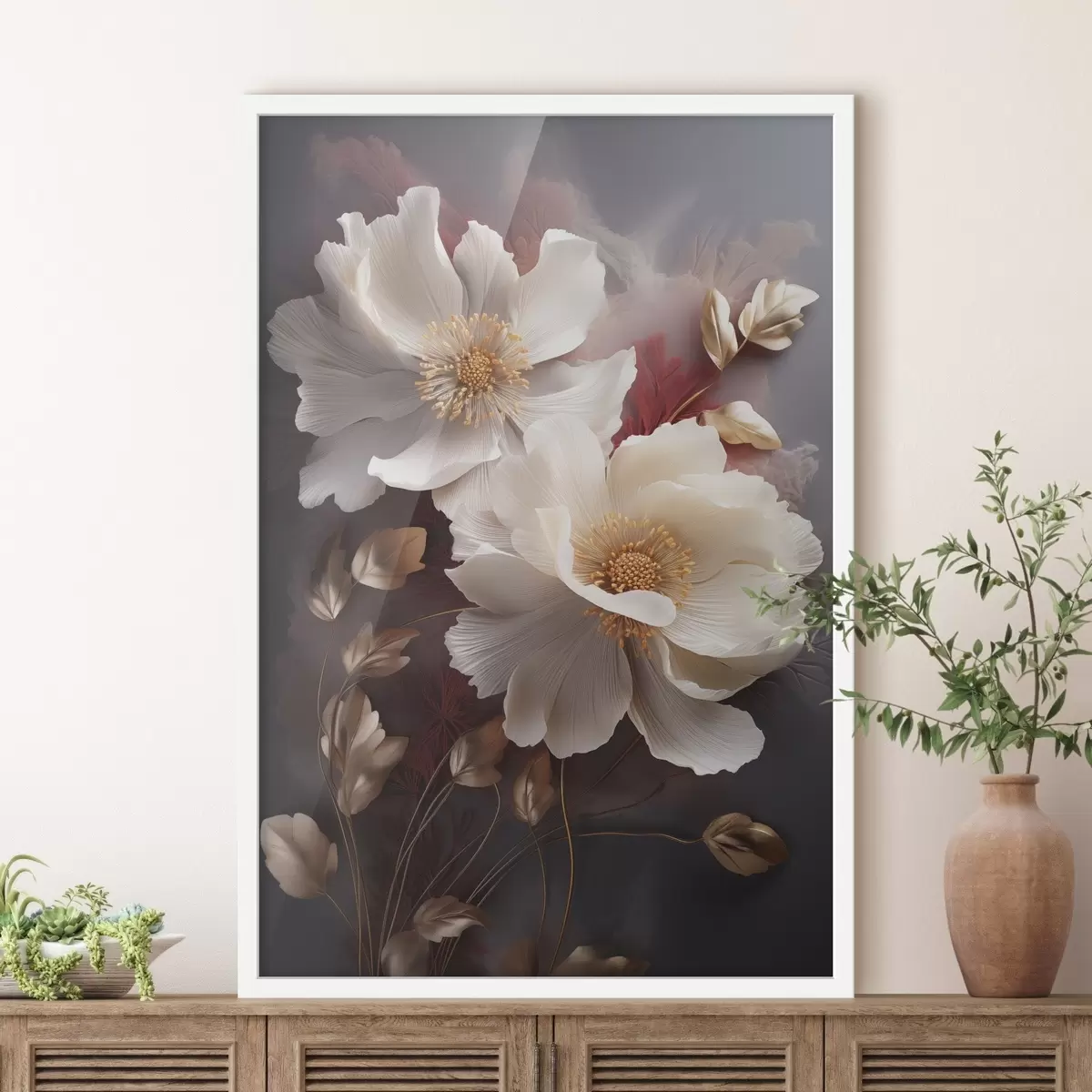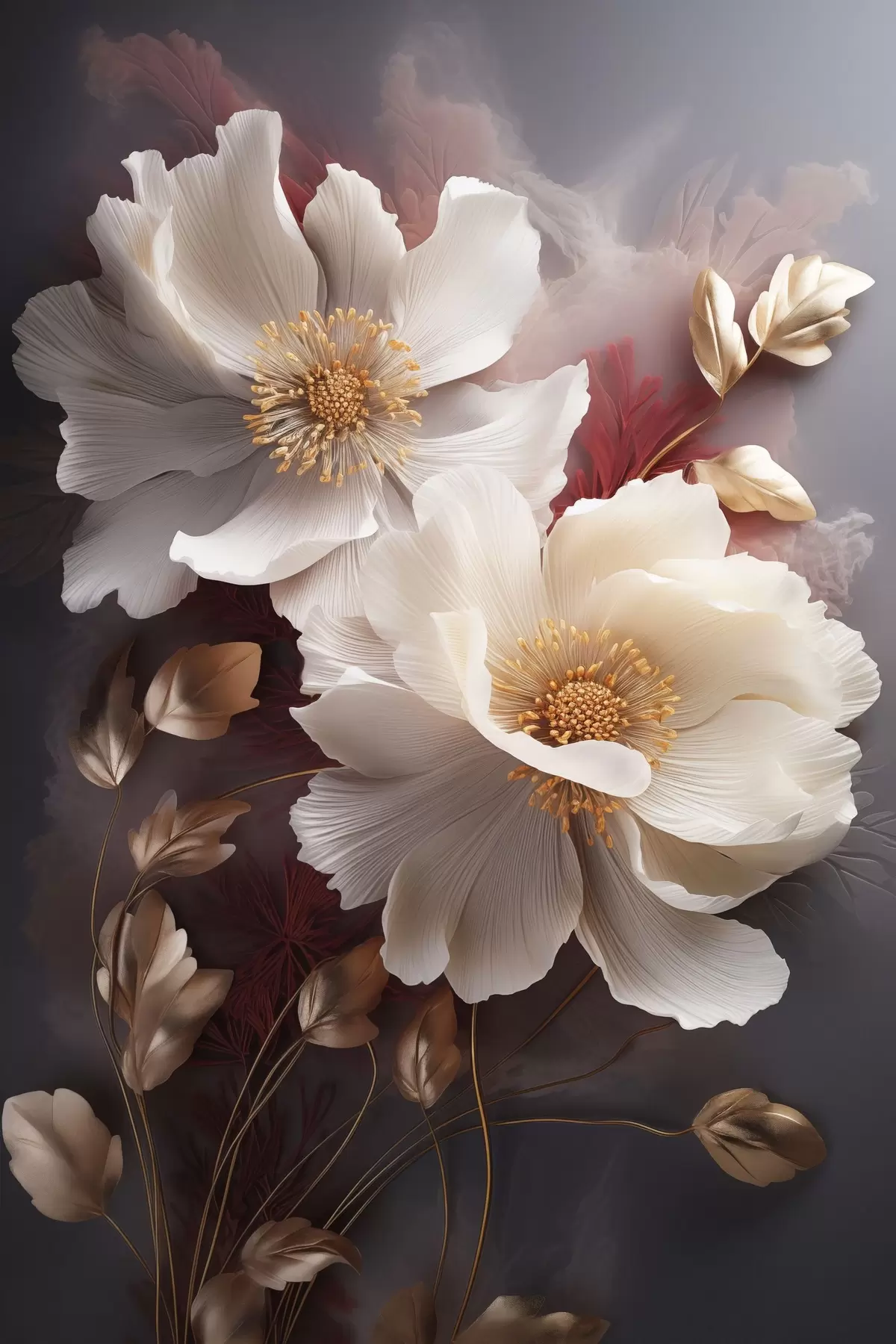 Poster Delicadas peonías con pétalos finos y tenues, rodeadas de hojas de color rojo oscuro y amarillo sobre un fondo abstracto. Nr f47435