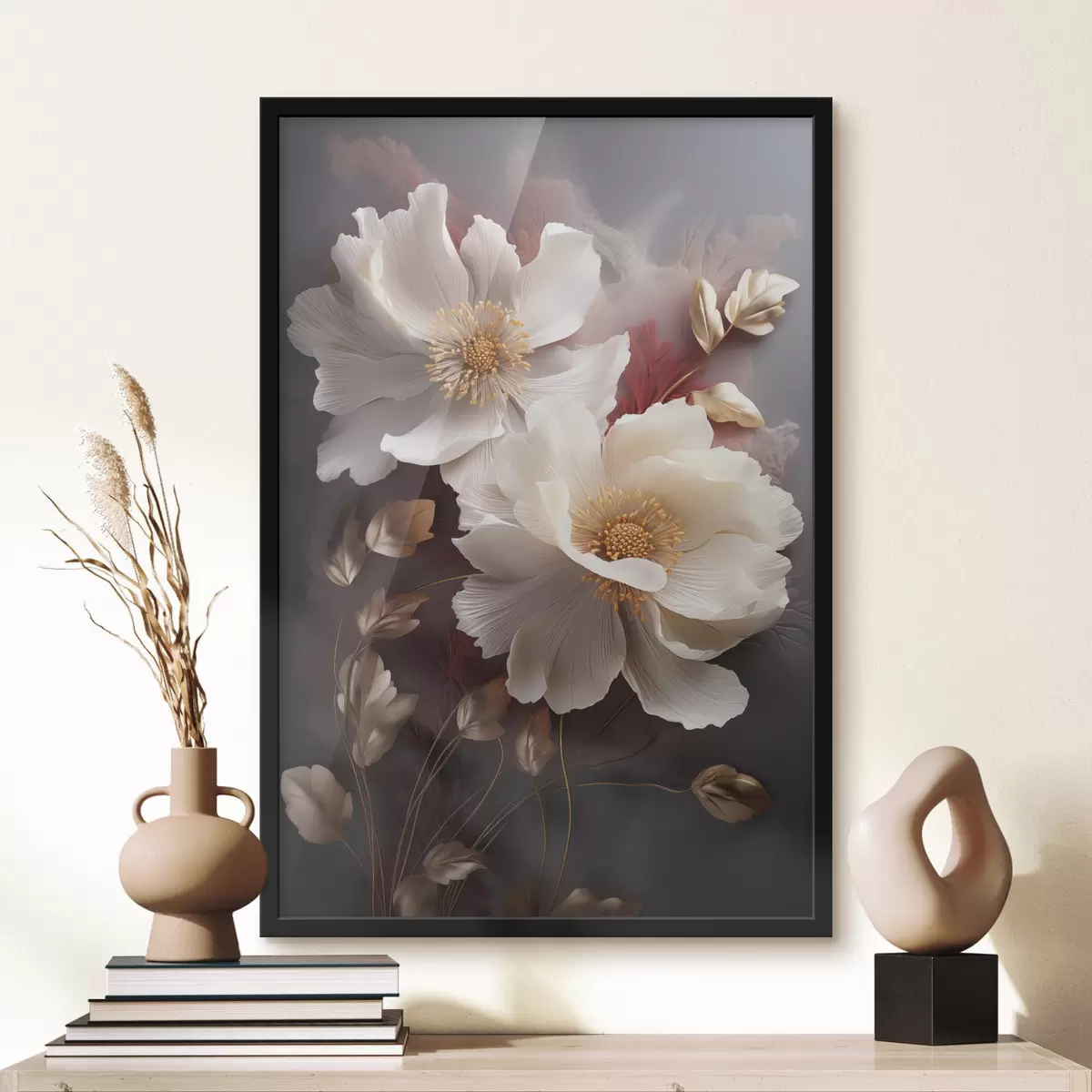 Poster Delicadas peonías con pétalos finos y tenues, rodeadas de hojas de color rojo oscuro y amarillo sobre un fondo abstracto. f47435